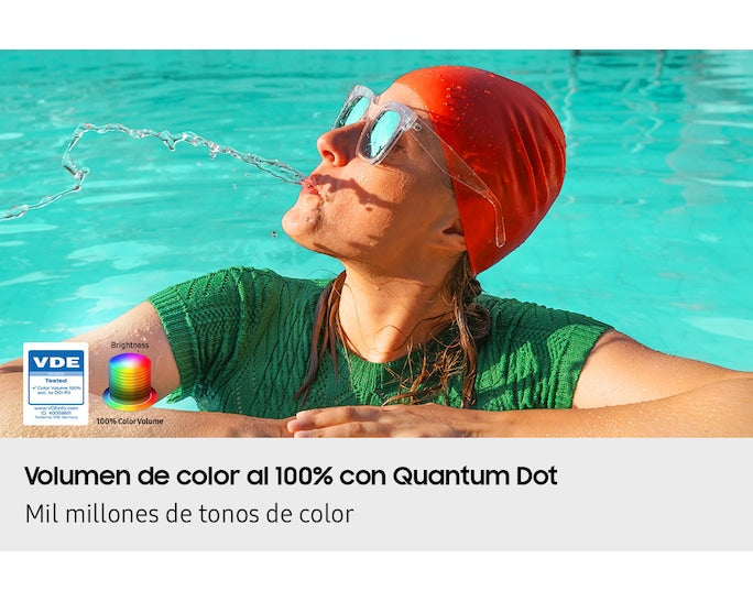 Una escena de una mujer en una piscina escupiendo agua. El logotipo indica VDE 01/2025. Volumen de color probado al 100 % según DCI-P3. www.VDEinfo.com. ID 40059611. Probado por VDE Alemania. Otro logotipo está compuesto por ruedas de color apiladas que representan el brillo. Las ruedas de color aumentan de tamaño para representar el 100 % del volumen de color. A medida que esto sucede, la escena de la mujer en la piscina se vuelve más brillante y vívida.